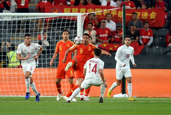 1月11日,阿联酋阿布扎比,2019亚洲杯小组赛C组,中国队3:0完胜菲律宾队。图为冯潇霆(左二)、赵旭日(左三)在比赛中。视觉中国供图