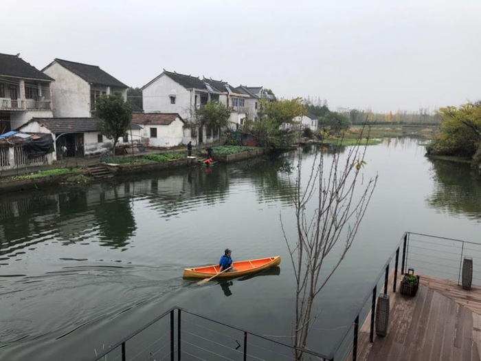 在计家墩最高档的民宿“溪地清舍”的楼顶平台上,可以看到对岸的几户老宅院落里,老村民仍然在维持着以往的生活,在水边洗菜。而河道里,一位新村民悠然地划着皮划艇。这几个场景拼贴在一起,构成了计家墩村的新面貌。