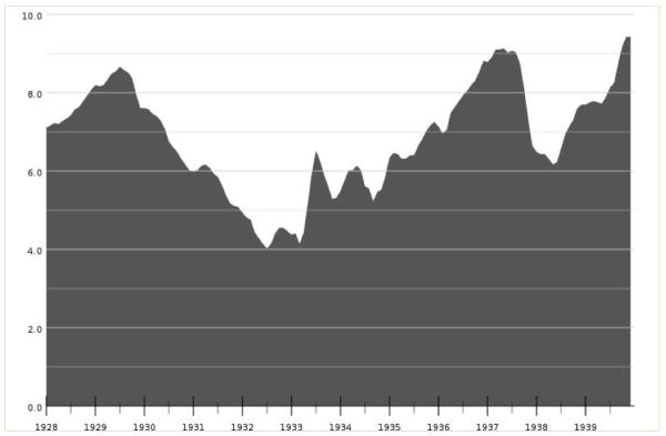 失业率指标显示的完全是别样的图景,如图六所示,整个1930年代期间,美国的失业率从来没有低于过百分之十。实际上当时除了希特勒的德国,全世界所有资本主义发达国家的失业率都是两位数。以失业率指标来衡量的话,新政的效果并不能令人满意。而且事实上新政在收入方面的刺激作用仅仅维持到1937年,之后其负面效果便开始显现,从图五中便可以发现1937年后的一次小衰退,图六所示的失业率更是在1937年又大幅提高。所有的政策都是有成本的,从第二次新政开始,罗斯福政府便要支付新政增加的成本。可以预料,倘若没有第二次世界大战,罗斯福恐怕也会和胡佛一样狼狈不堪。是第二次世界大战,而不是罗斯福的新政,拯救了美国经济。