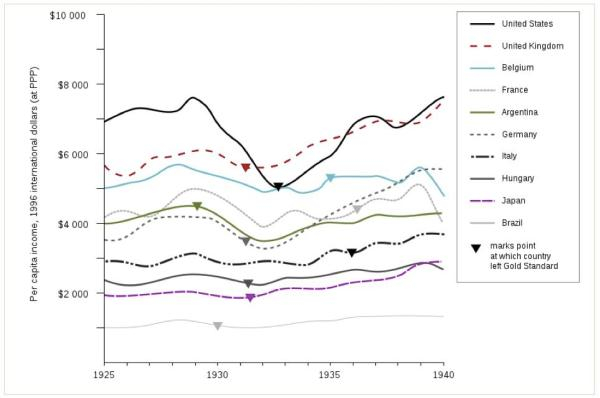 反过来,备受奥派学者指责的通货膨胀政策在应对大萧条时确有“奇效”,事实上到了1933年,在这场席卷全球的大萧条中,几乎所有实行货币扩张政策的发达国家都在某种程度上得到了暂时的“缓解”。那么这又是否说明米塞斯-哈耶克的货币理论是错误的呢?其实也不尽然。