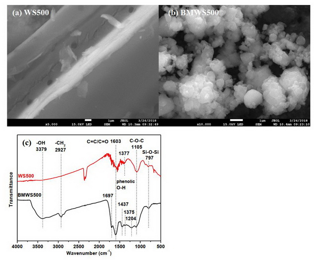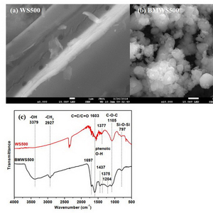 图1. (a-b) 未球磨生物炭WS500与球磨生物炭BMWS500的SEM图;(c)WS500和BMWS500的FTIR光谱
