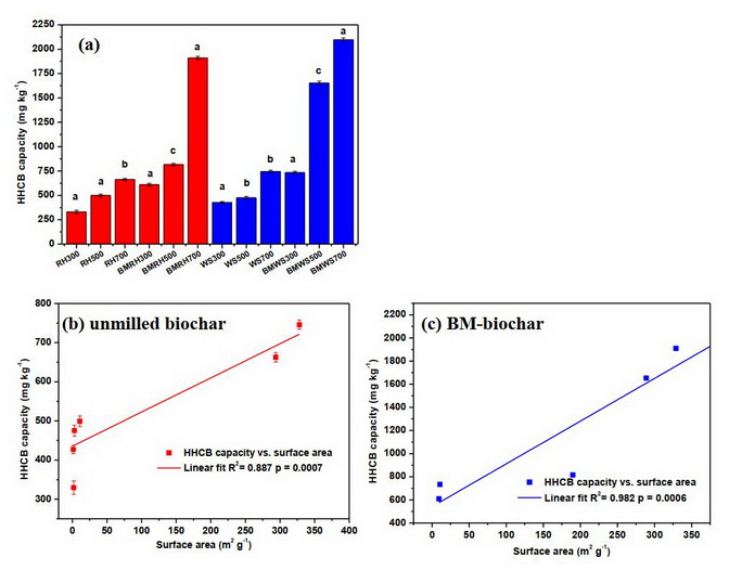 图2. (a) 原料类型和热解温度对未经球磨和球磨的生物炭从水溶液中去除HHCB效率的影响;(b-c) HHCB剂量与比表面积之间的关系