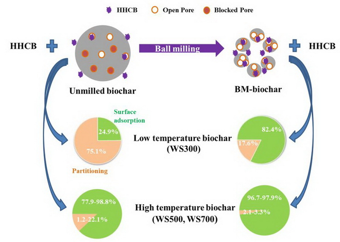 图3. 未球磨和球磨-生物炭吸附HHCB的机制