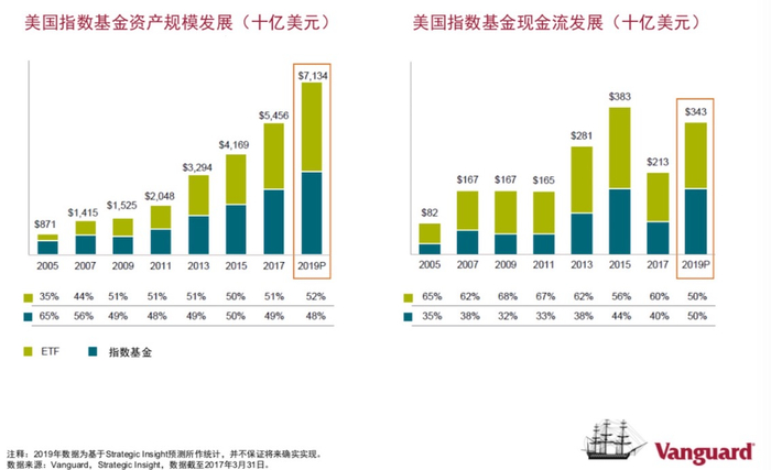 低费率也使得ETF吸引了众多人气。美国主动型基金费率大约每年0.77%左右,而ETF的费率大约是每年0.1%左右,前者是后者的八倍。林晓东也对记者提及,当年Vanguard将自身美国基金的资产加权平均费率从1975年的0.68%降低到目前的0.12%,还不到现在美国基金行业资产加权平均费率0.62%的五分之一。“虽然管理费不断下降,但越来越多人愿意购买公募基金产品,最终的效果是,增加了购买人数、整体行业规模扩大、实现长期稳定回报。”