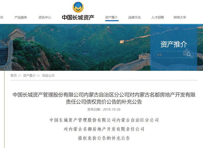据长城资于产2018年10月在北方新报发布的《中国长城资产管理股份有限公司内蒙古自治区分公司对内蒙古名都房地产开发有限责任公司债权竞价公告的补充公告》显示,长城资产拥有名都公司的债权总额93,786.16万元,由三笔债权构成。