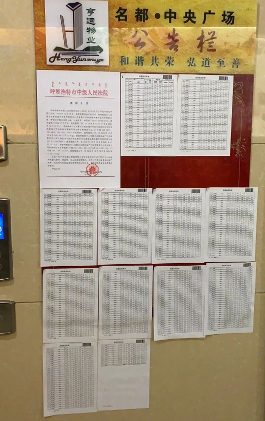 查封公告显示:呼和浩特市中级人民法院依据执行裁定书预查封被执行人内蒙古名都房地产开发有限责任公司已预售许可的位于名都中央公寓商住楼在建工程抵押部分共337户,查封期限三年,并附有337户具体的名单。