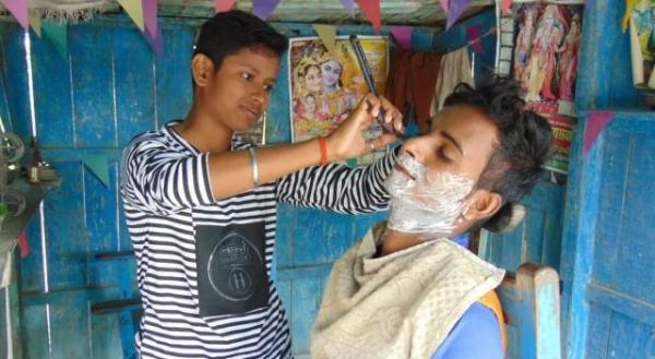 16岁的妹妹Neha为客人修剪胡子。