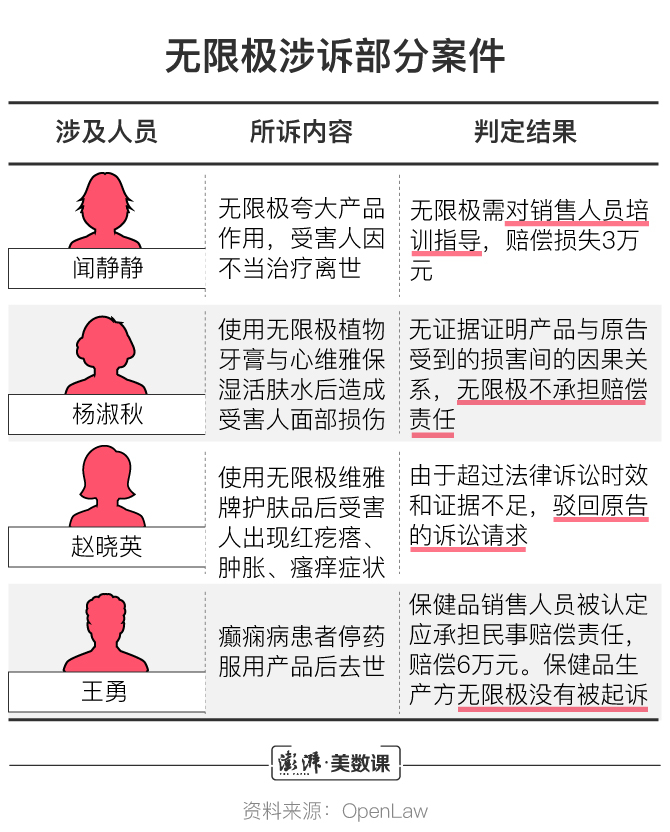 但在这4起案例中,仅有1起案例获得无限极赔偿3万元,其余3起案件或因证据不足,或因超过诉讼时效,或因未被起诉,无限极均没有承担相应赔偿责任。