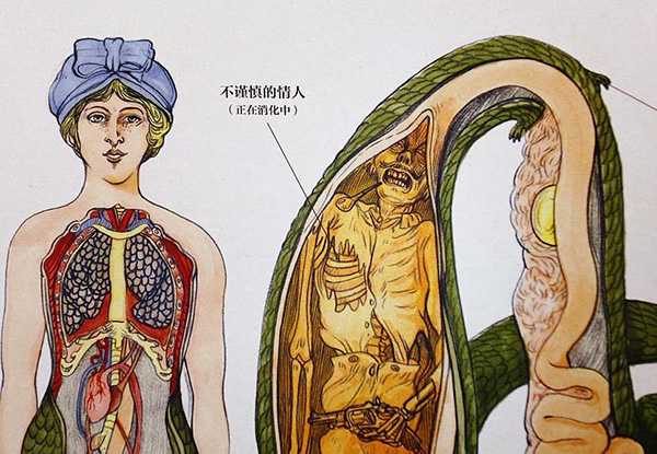 继《博物学家的神秘动物图鉴》以后,未读在这个神奇的领域继续深耕,于2018年7月出版了《超自然变形动物图鉴》。延续前者的惊人的想象力和画风,作者继续正儿八经地剖析那些神话里杜撰出来的动物和神人,比如青蛙王子、月桂女神、蛇女、狼人、吸血鬼、半人马甚至天使……作者从神话、史诗、小说、电影以及真实自然中汲取灵感,构建了关于超自然变形生物的百科全书,栩栩如生地展现了变形物种的每一个变化阶段:比如蛇女的消化系统是怎样的,蟑螂人的神经系统是怎样的,狼人的骨骼构造如何,中国龙怎么从鱼变形为龙的。