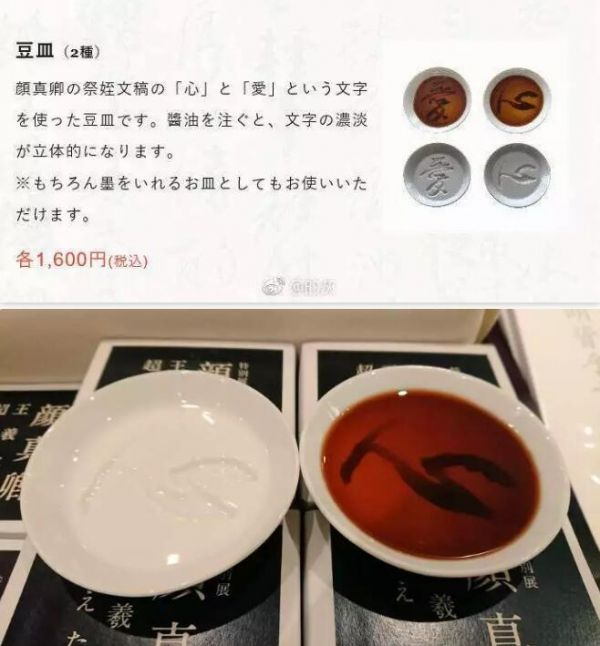 类似的周边商品,还有用《祭侄文稿》中汉字制成的酱油碟。倒入酱油,就可以清晰地看到碟底的文字。