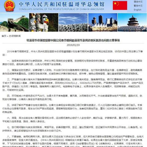 中新网1月21日电 据中国驻加拿大温哥华总领馆网站消息,2019年春节假期将至,中华人民共和国驻温哥华总领馆谨提醒计划在春节期间赴温哥华及周边地区旅游、访问的中国公民注意安全,度过一个平安顺利、欢乐祥和的春节。