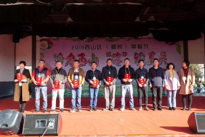 1月19日, 2019年西山区(碧鸡)草莓节在碧鸡街道西华社区红映广场正式开幕,为期三天的云南省第二届草莓产业发展研讨会暨2019年西山区(碧鸡)草莓节进入关键环节。来自全省各地的32个品种共77个草莓样品在昆明参加“擂台赛”,最终昆明地区两家企业选送的圣诞红、白雪公主两个样品摘得桂冠,其他20个样品也获得不同奖项。