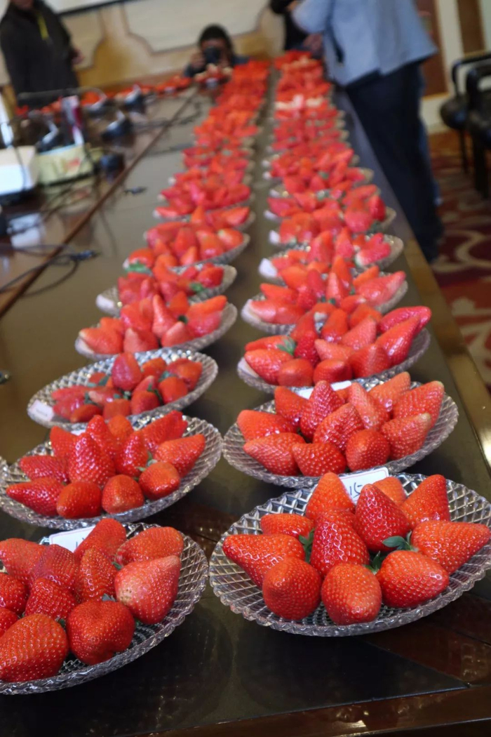 擂台赛按照很规范的流程进行摆盘、编号后,由草莓种植专家、媒体代表、市民代表等组成的评委会成员对样品的外观和内在进行打分,外观主要是色泽、果形方面评判。内在主要是甜度、香味和口感等。