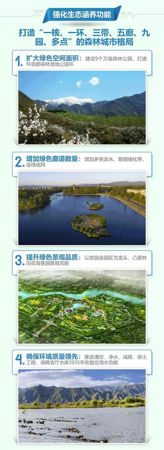 在强化生态涵养功能方面,规划明确,打造“一核、一环、三带、五廊、九园、多点”的森林城市格局。在扩大绿色空间面积方面,计划建设9个万亩森林公园,打造环首都森林湿地公园环。同时,增加绿色廊道数量,增加多条滨水、路侧绿化带,连绿成网。以世园会园区为龙头,凸显林田花海景园景观风貌,提升绿色景观品质。推进清空、净水、减排、保土工程,保障官厅水库2035年恢复饮用水功能,确保环境质量领先。