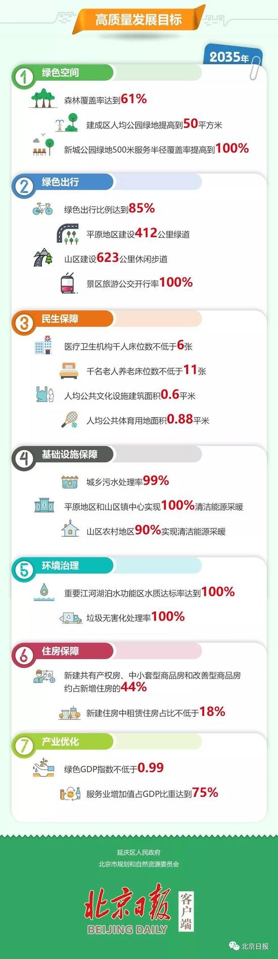 根据规划要求,延庆将围绕绿色交通和基础设施、治理模式创新、生态环境保护与环境治理、绿色产业转型、民生服务保障、保护文化与特色风貌、城乡统筹、民生服务保障七大建设领域开展工作。力争到2035年,城市规模达到全区常住人口48万,城乡建设用地88平方公里。