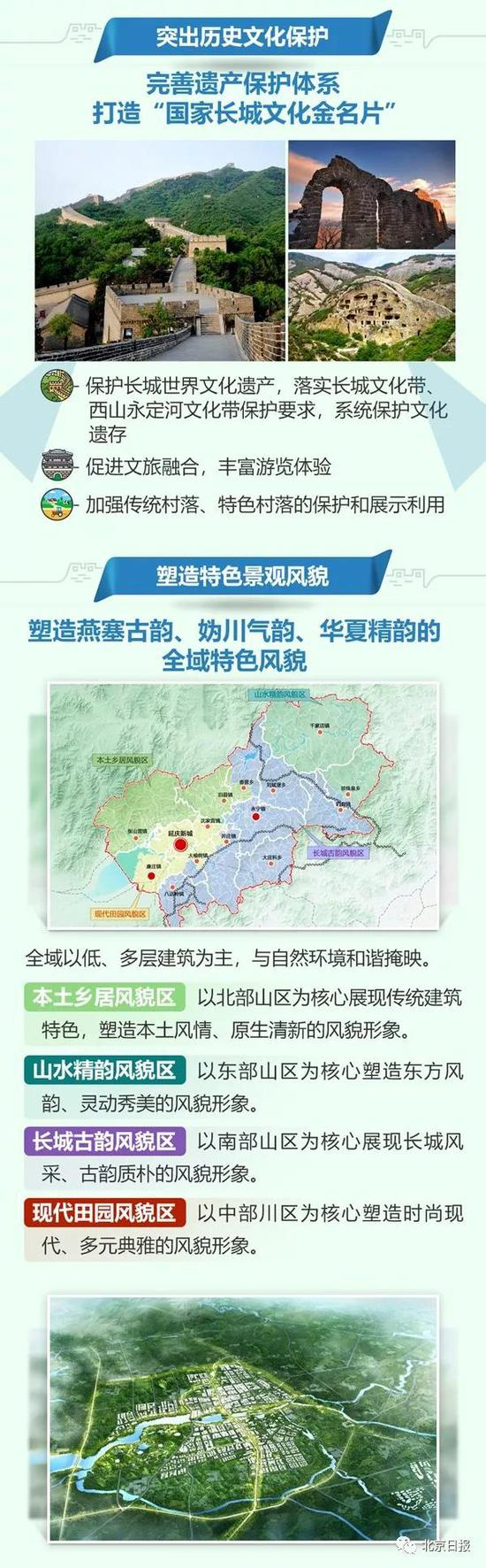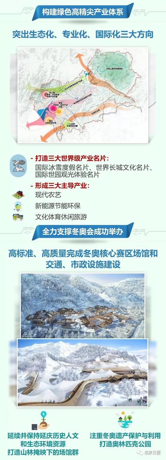 除此之外,还要突出历史文化保护,完善遗产保护体系,打造“国家长城文化金名片”;塑造特色景观风貌,塑造燕塞古韵、妫川气韵、华夏精韵的全域特色风貌;构建绿色高精尖产业体系,突出生态化、专业化、国际化三大方向。