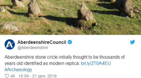 阿伯丁郡议会也不得不发推特澄清,“阿伯丁郡石圈此前被认为有数千年的历史,现在发现是一个当代的复制品”。