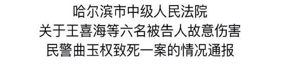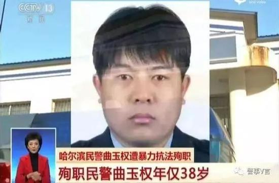 当天下午16时59分,在哈尔滨一家名为“你要红”的量贩式KTV中,5人因喝酒发生口角。哈尔滨市公安局道里分局太平庄派出所民警曲玉权、李振东迅速赶到现场,在依法处置斗殴事件时,遭到违法犯罪嫌疑人袭击,曲玉权受伤被送到医院,救治无效不幸牺牲,年仅38岁。