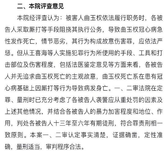 简单来说,法院认定曲玉权的死亡是在患有冠心病的基础上,由于被人厮打致多处软组织损伤、剧烈活动等因素导致冠心病急性发作引起的。被告人没有追求曲玉权死亡的主观故意,应该以故意伤害罪论处。