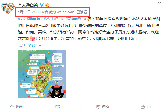 岛内各县市开设微博账号推广观光,像台南、高雄市府的官方账号早在民进党籍市长执政时便开设。截图来自微博