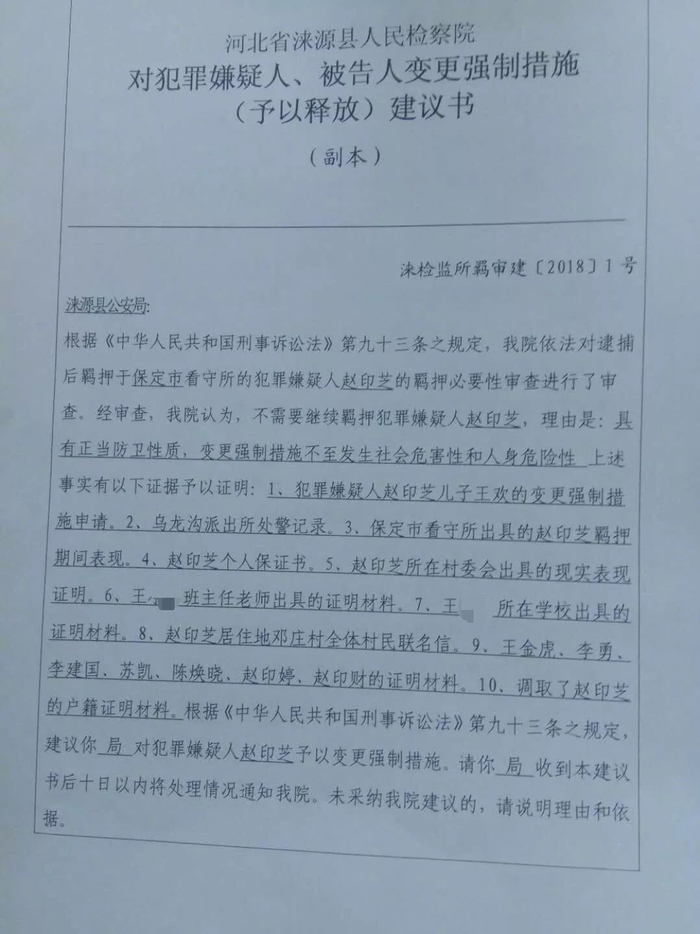 涞源县人民检察院向涞源县公安局发出的《对犯罪嫌疑人、被告人变更强制措施建议书》中称,赵印芝主观上没有杀人的故意,客观上造成王磊的死亡是属于刑法规定的正当防卫性质。小月一家长期遭受不法侵害,一家人无法正常生产生活,建议对赵印芝变更强制措施。