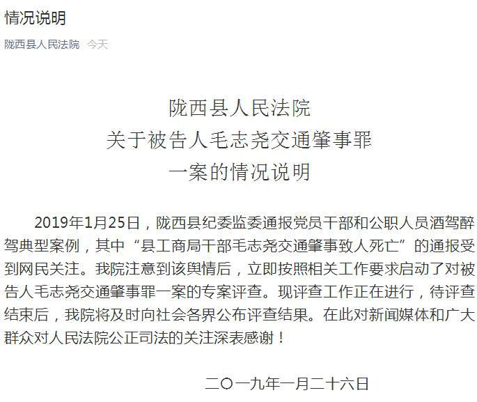 今天(26日),陇西县人民法院通过其官方微信公号作出情况说明称,该院注意到该舆情后,立即按照相关工作要求启动了对被告人毛志尧交通肇事罪一案的专案评查。现评查工作正在进行,待评查结束后,该院将及时向社会各界公布评查结果。