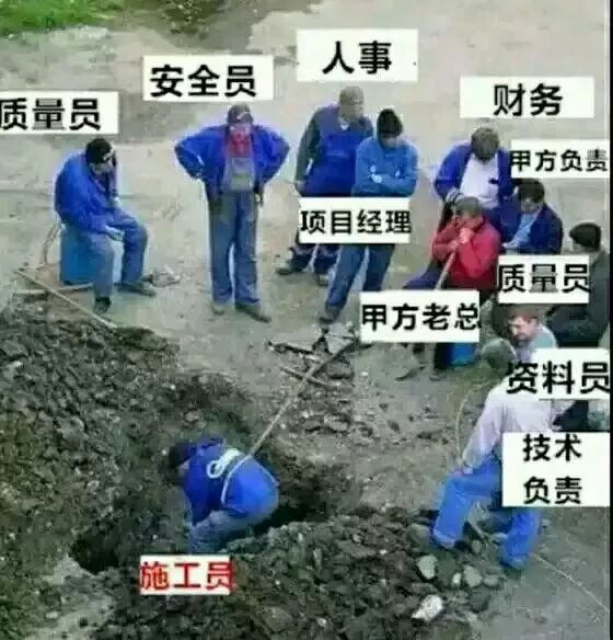 Here in Baltimore all construction projects consist of 10 people, but only three people actually working。