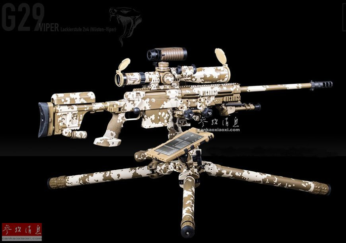 德国黑内尔公司研发的G29“蝰蛇”狙击步枪,图中配有三脚架及单兵弹道计算机。