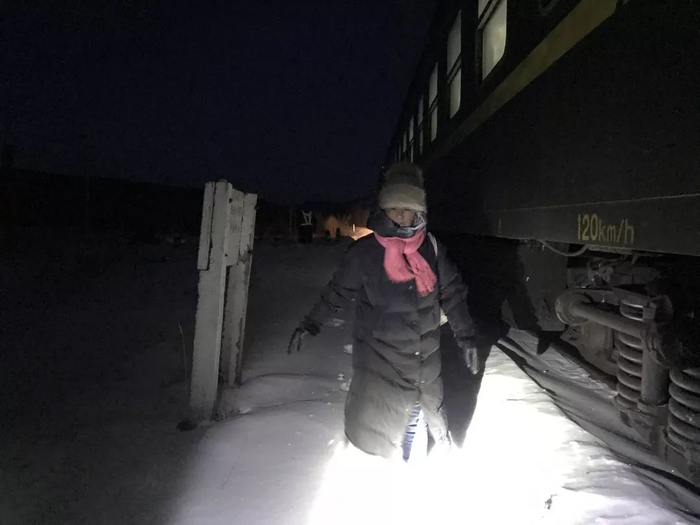6点20分,4182次列车准时从满归站出发。运行17分钟停在第一站阿乌尼,这里出入的只有一户人家,天还没亮,女主人李秀英顺着张所有的手电光线踩着膝盖那么厚的雪,在乘务员的搀扶下爬上火车。