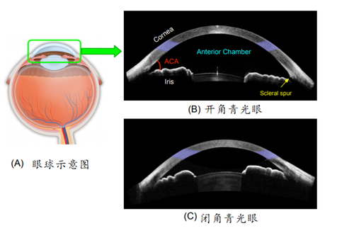 (A)AS-OCT图像捕捉眼球的前段区域,包括角膜、虹膜、睫状体和晶状体(B)开角(C)闭角