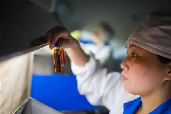 在生产车间,我们看到,准备好的药液和玻璃瓶在经过严格卫生安全把关后,一起被输送到液体灌封机进行灌装、轧盖。 药液完成灌装轧盖后再通过灭菌柜的处理,将密封瓶体内的微生物控制在国标范围后,一支支蓝芩口服液“移驾”灯检车间,接受自动灯检。