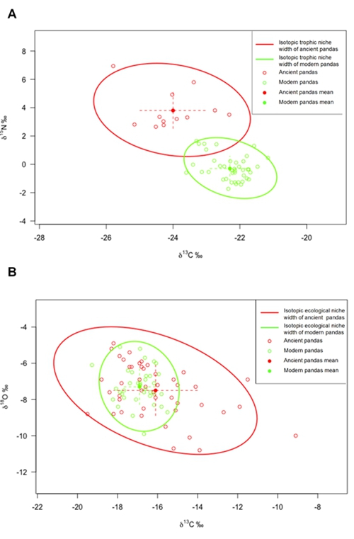 由于埋藏条件的限制,以及骨骼中有效生物成分的保存期限,更长时期的样品无法得到有效数据。研究人员选择了具有强抗降解能力的牙齿样品,测定其中牙釉质部分的碳、氧稳定同位素值。碳同位素结果表明,无论何种大熊猫(包括小种大熊猫、巴氏大熊猫等)生活在什么年代(上新世晚期到现在),都是以C3植物为食。不同的是历史上大熊猫的碳同位素值变异系数更大,表明其食性较现生更为多样,而不仅仅是现生所食用的这些竹子。