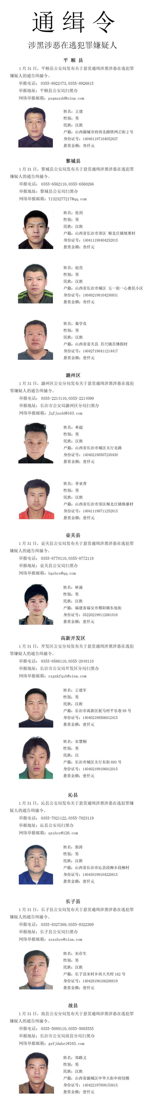 1月31日,长治警方发布通令,向全国公开悬赏通缉12名涉黑涉恶在逃犯罪嫌疑人,希望广大人民群众积极检举揭发。凡发现在逃犯罪嫌疑人的具体落脚点或藏身地等线索,均可以通过长治市、县(区)公安机关“扫黑办”进行举报。公安机关将对举报人或协助公安机关抓获在逃犯罪嫌疑人的公民个人信息严格保密。