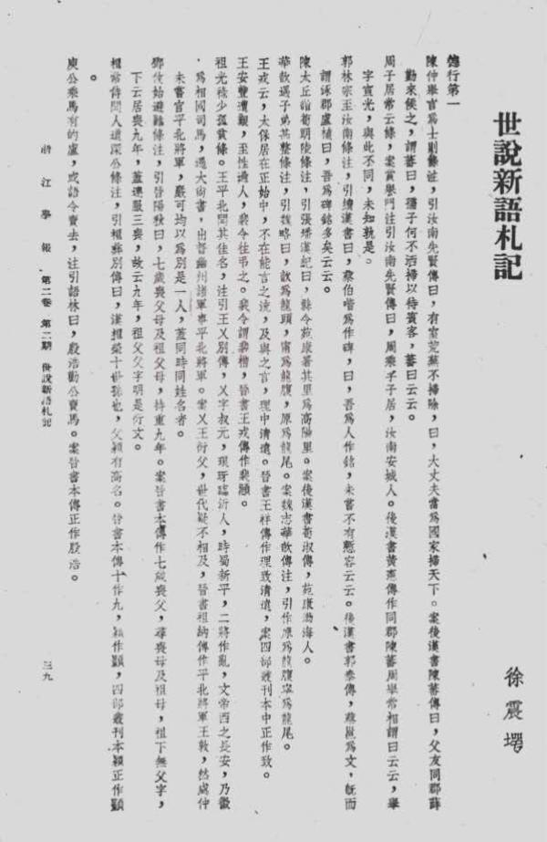 这番说明很容易让人联想到徐氏晚年才着手写定的《世说新语校笺》(中华书局,1984年),在该书《前言》里同样强调,“《世说新语》一书所载的许多遗闻轶事,给读者从各方面勾划出这一历史时期的生动画面”,“言简味永,栩栩如生,得到的印象,比之读一部史书,更加集中,更加深刻”,和《汉魏六朝小说选》的论旨显然一脉相承。他在《校笺·前言》中还回顾了多年来的研究历程,说起“此校笺稿乃是二十余前的札记,当时读这部书,颇多不易通晓之处,曾取《后汉书》《三国志》《晋书》互相参校,遇有异同,就写在书眉上”。据此寻绎追溯,所说的“札记”当指他早年发表的一篇《世说新语札记》(载1948年《浙江学报》第二卷第二期),其主旨虽然仅在于“取诸史比勘,疏记异同”,尚未臻于细密周备,但也已略引端绪,堪称大辂椎轮。而从最初草创的《世说新语札记》发展到稍具雏形的《汉魏六朝小说选》,以至最终修缮完备的《世说新语校笺》,前后历时已逾三十载,足见他于此书寝馈极深而孜矻不懈了。