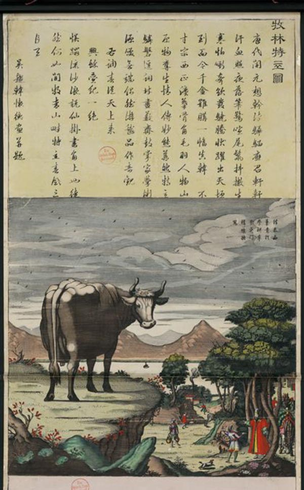 此次展出的部分“姑苏版”作品来自英国木版教育信托主席冯德保(Christer von der Burg)的收藏,他将自己的收藏和柏林国家图书馆中的版画收藏做比较,发现柏林所藏韩怀德《牧林特立图》,其范本来自于十七世纪荷兰艺术家亚伯拉罕・布鲁马斯于1611年所创作的《动物系列》版画,这为苏州版画受西洋影响找到了确切的证据。