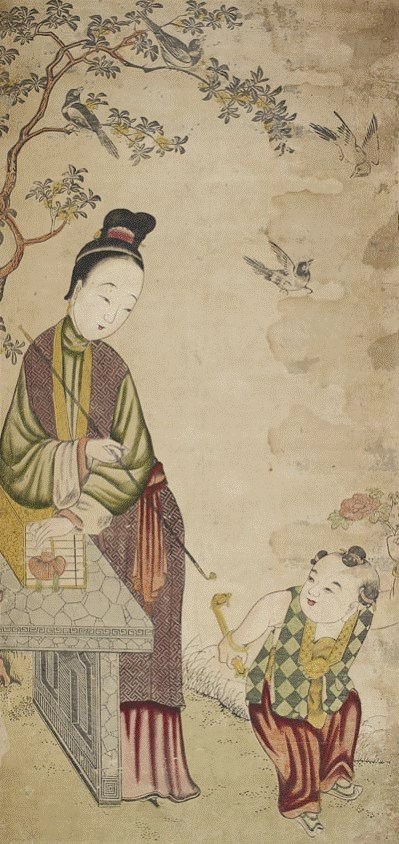 此外从《麻姑献寿》、《执笛望子》、《百子图》等画面中也可以看到当年百姓的生活面貌和场景,这类“仕女婴戏”题材的版画作品中看到古代的审美习惯是细腰削肩的古典美人和大头娃娃像。但是西方对于肖像画技法中的面部阴影表现,在当时被称作“阴阳脸”是不能被中国审美所能接受的,所以这些图中人物面部的阴影对比不明显。
