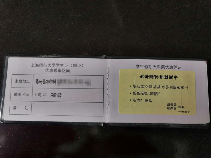 李响的学生证张贴有“学生火车票优惠卡”,乘车区间处未加盖学校公章。当事人供图