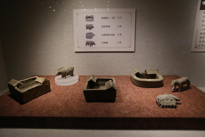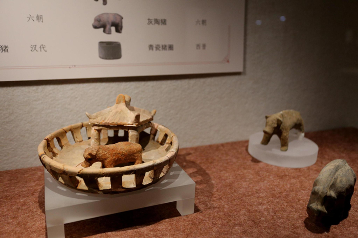 南京博物院、徐州博物馆、扬州博物馆等省内主要博物馆内均收藏各种灰陶、红陶、木质地的家猪、野猪模型,年代从东汉、西晋到六朝、唐代皆有。古人视死如生,阳间的物质生活内容要在地下复制和“再现”,陪葬品中大量猪模型的出现,说明了猪是古代庄园经济生活的重要组成部分,是墓主生前重要的财产。