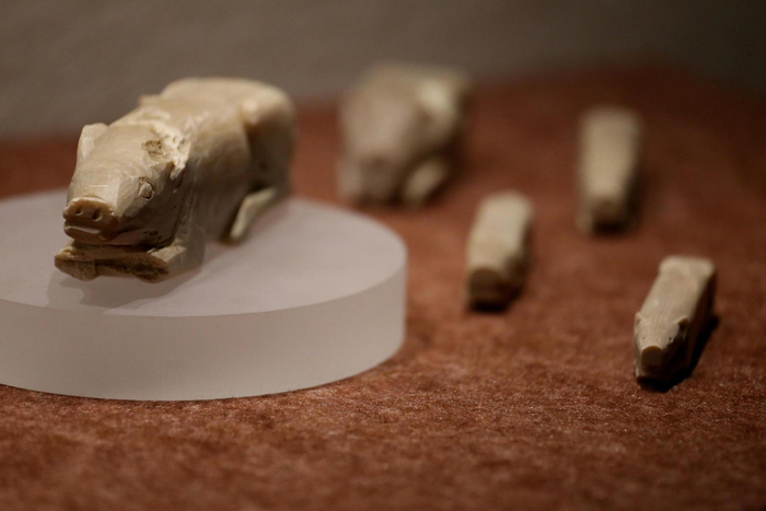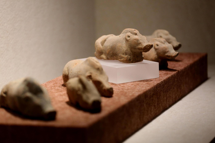 南博专家介绍,这组猪形罐出土于1993年发掘的高邮龙虬庄遗址(江淮地区东部最大的一处新石器时代早期遗址,距今七千至五千年前),这说明了新石器时代人们已经将野猪驯养成家猪,饲养家猪,与渔猎经济和水稻栽培共生出现。