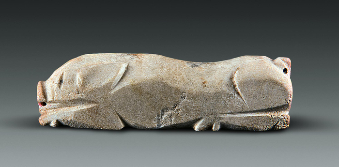 在先民的眼中,猪具有崇高的地位,拥有神奇的力量,它繁殖力强,生长快,肉脂多,成为农耕文明出现后人们渴求繁衍、多产、丰收的物化体现。猪的形象也越来越多地出现在各种器具上。红山文化遗址(距今6000—5000年前)出土的“玉猪龙”,将猪头与龙身融合起来,还有个小小的獠牙,生动记录了红山文化先民对猪的喜爱和崇拜。