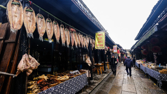 1月6日,安昌古镇的老街上挂着各种传统腊味食品。图片来源:新华社