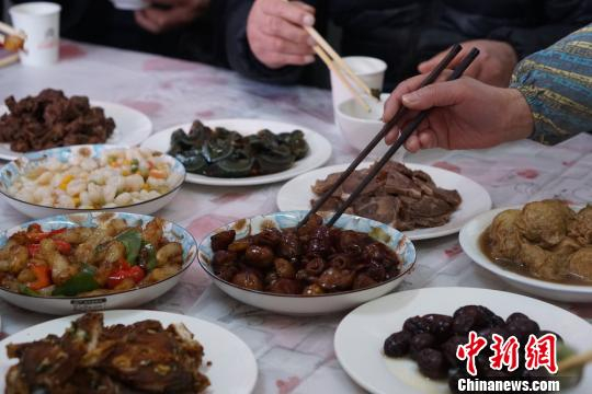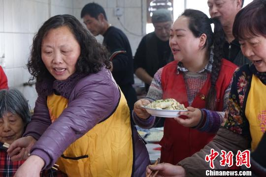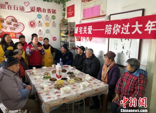 林水芳组织社区的困难老人们聚在一起,这已是该社区连续第三年办年夜饭活动了。 孙权 摄