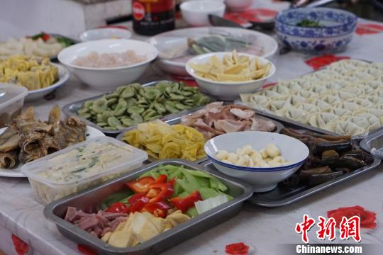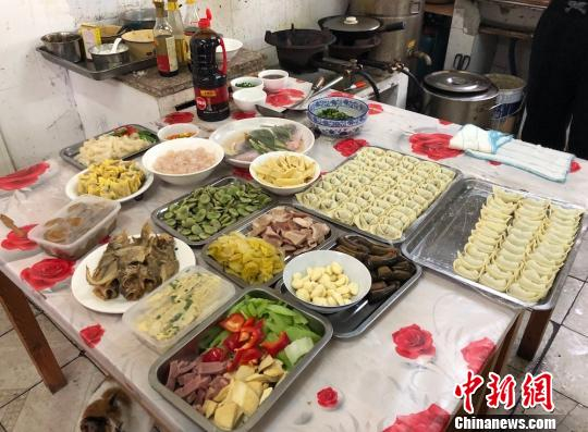 志愿者们为老人们包的馄饨。在当地,过年吃馄饨是一种习俗。 孙权 摄