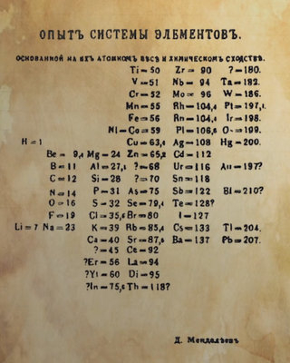 当时世上为人所知的63种化学元素纷纷落在相应的格子里,组成了一张表。它们依照原子质量排列,随着质量的增加呈现出有规律的变化。