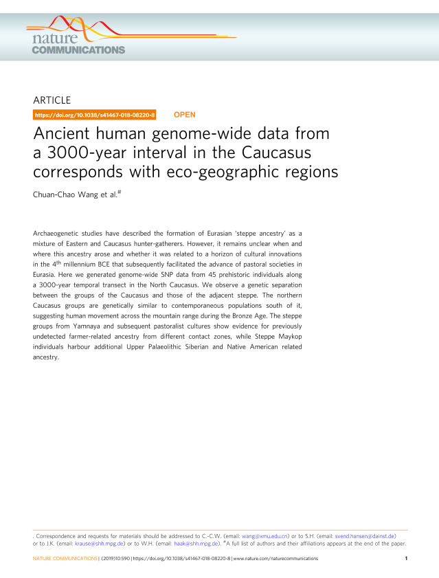 2月4日除夕,《自然•通讯》(Nature Communications)在线刊出了厦门大学人类学研究所所长王传超教授作为第一作者和通讯作者发表的题为“Ancient human genome-wide data from a 3000-year interval in the Caucasus corresponds with eco-geographic regions”的研究论文,报道了高加索地区3000年间的古代族群的遗传结构与生态地理区域的相对应关系,更详尽解析了距今5000多年前的青铜时代早中期以颜那亚(Yamnaya)文化为代表的欧亚草原人群的形成历史。