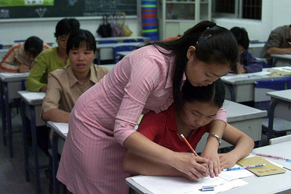2003年5月10日晚,厦门莲龙小学首期流动人口扫盲工作培训班正式启动。图为老师手把手教学员写字。视觉中国 资料图