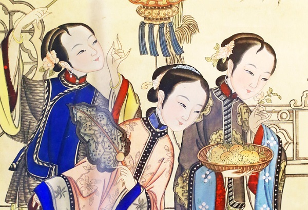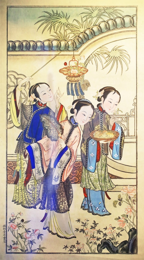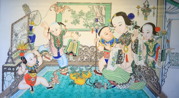 彩绘部分是区别其他年画的重要工艺。无论是苏州桃花坞,还是潍坊杨家埠,它们最多是在印刷之后,再做全色,而不是以彩绘为主。杨柳青年画“玉成号”第七代传人韩平告诉澎湃新闻,“杨柳青年画在全国都有名,它有名在哪?就是它在木版套印的基础上,比别其他年画多了一道手工上色。杨柳青年画与其他年画相比,较为细腻工整,也是因为多了一道手工上色。在彩绘杨柳青年画时,不同的地方,其彩绘的方法是不一样的。而且彩绘不是一编就能形成的。比如,《莲年有余》里面的荷花,首先要把荷花的颜色平涂,然后就进行渲染,要注意渐变色。从浅到深,但是在渲染的过程中,至少要渲染三四遍。第三步,就是勾线,即在原来木版线的基础上,在‘着线’,这样就让画面更加立体。这只是荷花的上色方法。如果画娃娃的脸部,着色加‘着线’将有20几遍的绘制工序。” 仕女年画局部 《琴棋书画》 “玉成号”作品