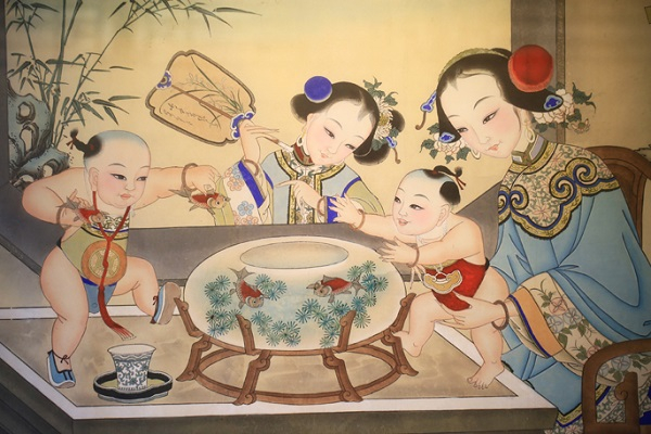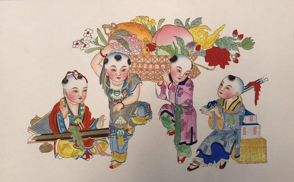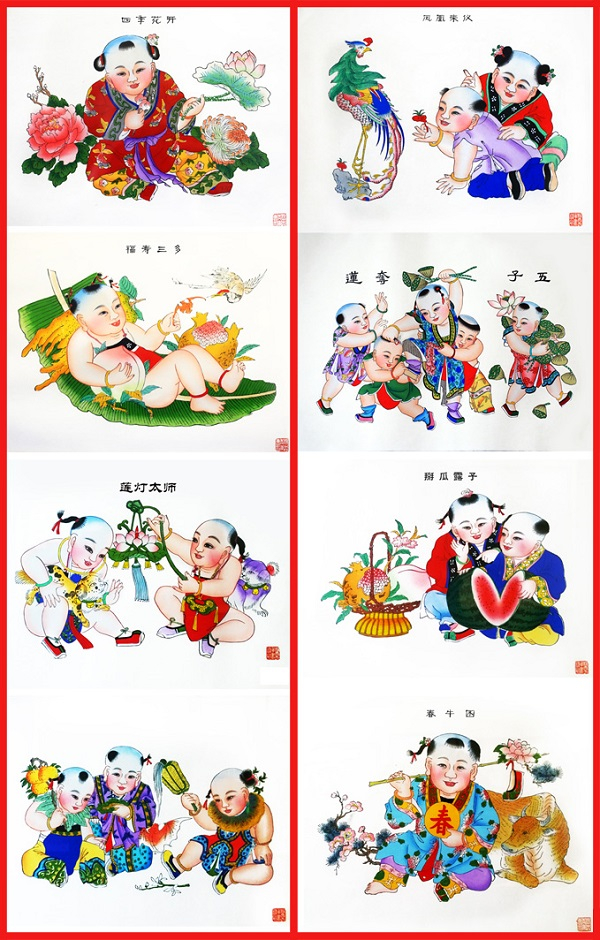 澎湃新闻了解到,杨柳青年画主要分为民俗类年画、娃娃类年画、民间故事类年画、神像类年画、仕女类年画五大类。其中尤以娃娃画最具代表力,如果说《一团和气》是苏州桃花坞年画的代表性作品,《莲年有余》便是天津杨柳青年画的典型。杨柳青的娃娃画的特点:短胳膊短腿大脑壳、小鼻子大眼没有脖、鼻子眉眼一块凑、千万别把骨头露。《莲年有余》、《五子多莲》就是属于娃娃类。《仕女游春》、《琴棋书画》等属于仕女类。而娃娃仕女放在一起的题材也是非常受欢迎,如《浴婴图》、《福善吉庆》、《金玉满堂》等。《瑞雪丰年》、《庄稼忙》、《庆赏元宵》都属于民俗类的。《水浒传》、《红楼梦》、《狄青招亲》等属于民间故事类,《财神》、《门神》属于第五类神像类。