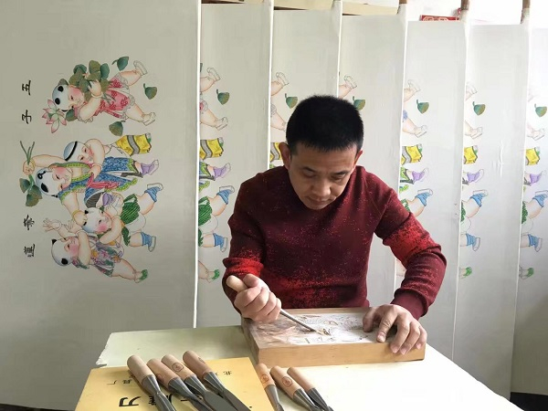 他说,天津杨柳青年画有五道年画制作工艺:出稿、刻板、印刷、彩绘和装裱,即“勾、刻、印、绘、裱”。在刻板时,线条一般被分为三级。不同的线条刻画,使得杨柳青年画产生非常强的节奏感。一级线条是脸部的线条,因为是脸部比较细腻,一定要把眼刻出神来;二级线条是衣纹,衣纹一定要刻出动感出来;三级线条就是背景,一定要分出层次来。 出稿