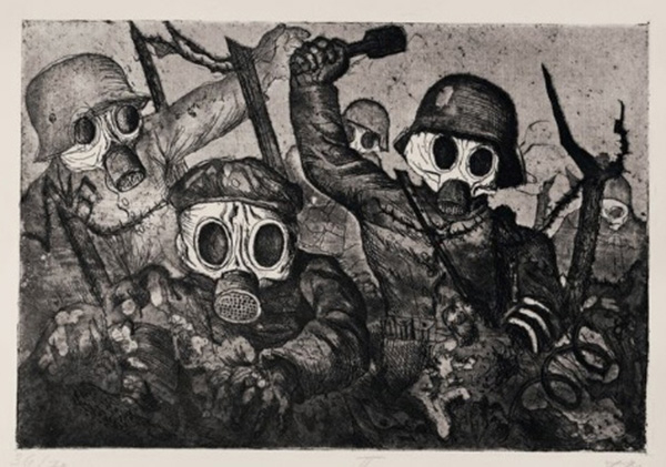 奥托·迪克斯一战前线速写版画,《戴防毒面具的冲锋部队》